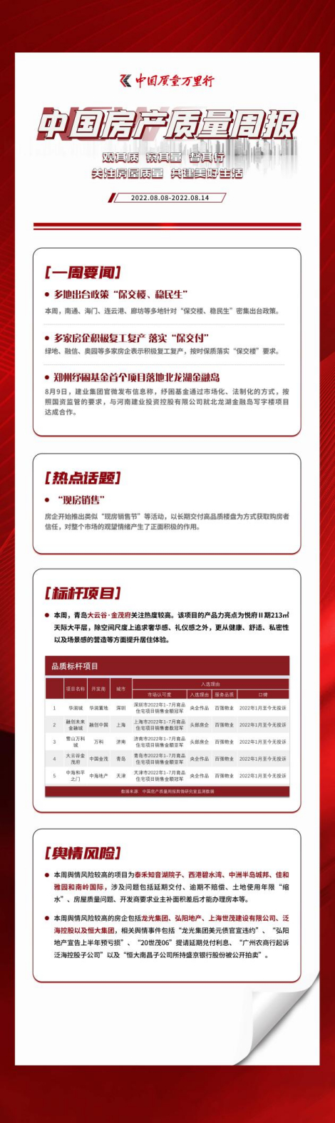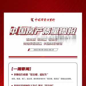 8月8日至8月14日,中国房产质量周报全网监测房产质量领域的要闻报道,监测发现,在政策层面,本周内河北廊坊、江苏南通、江苏连云港等多地出台政策落实“保交楼、稳民生”,涉及松绑限贷、松绑限售、放宽公积金贷款、出台购房补贴。在房企层面,本周内绿地、融信、奥园等多家房企表示积极复工复产,按时保质落实“保交楼”要求。