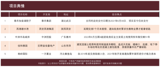在项目舆情方面,本周中国质量万里行共收到56条业主投诉信息,加上网络监测的舆情数据,最终整理出5个需要重点关注的问题项目。具体来看,本周舆情风险较高的项目分别为泰禾知音湖院子、西港碧水湾、中洲半岛城邦、佳和雅园和南岭国际,涉及的开发商包括泰禾集团、西安西港集团、中洲控股、巨野县佳豪地产和一方置业。涉及的问题包括:延期交付、逾期不赔偿、土地使用年限“缩水”、房屋质量问题、开发商要求业主补面积差后才能办理房本等。