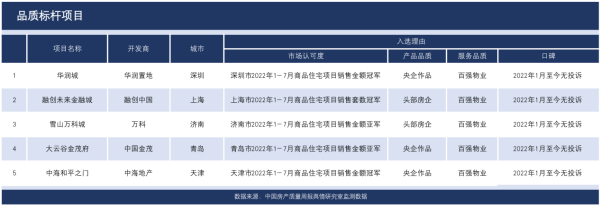 8月8日至8月14日,中国房产质量周报基于市场认可度、产品品质、服务品质及口碑四个维度,从百城热销楼盘中选取本周关注度较高的五个品质标杆项目,包括深圳市华润城、上海市融创未来金融城、济南市雪山万科城、青岛市大云谷金茂府和天津市中海和平之门。