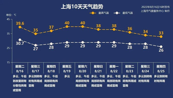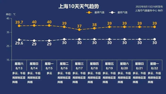 毫无悬念,上海今夏第43个高温日(35℃及以上)诞生了。据上海中心气象台预报,上海中心城区(徐家汇站)今日(16日)最高温定格39.6℃,并成为今年第27个酷暑日(37℃及以上)。