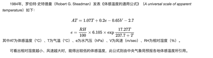 人们实际感受到的气温可要复杂多了。体感温度是指人体在不同环境下感受到的空气温度。在相同的气温条件下,人们会因湿度、风速、太阳辐射、着装颜色甚至心情等不同而产生不同的冷暖感受,它有一套十分复杂的计算公式。以1984年罗伯特、史特德曼发表的体感温度通用公式来看,与体感温度相关的变量包括气温、水气压、风俗、相对湿度等等。
