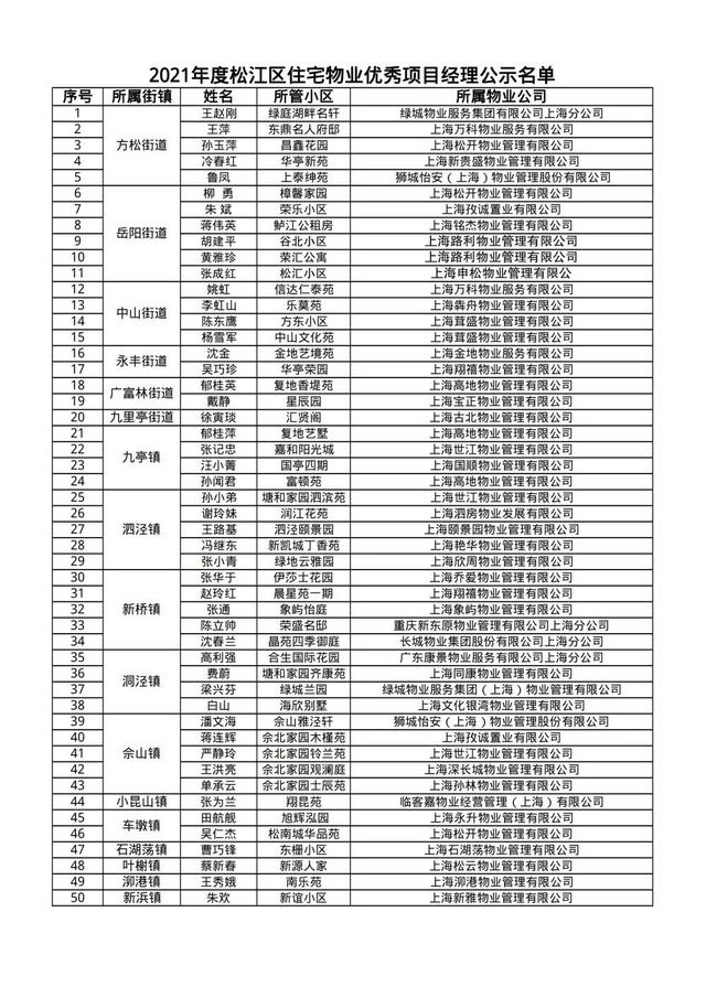 松江区房管局按照《2021年度松江区优秀物业评选奖励工作方案》,通过各街镇推荐、区局综合汇总、相关部门意见征求、考评组现场考核等程序,拟推荐2021年度松江区优秀示范住宅小区50个、2021年度松江区住宅物业优秀项目经理50个,现予公示。