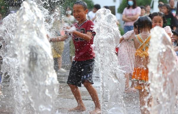8月12日,南京市小朋友在街头喷泉处戏水纳凉。图片来源:视觉中国