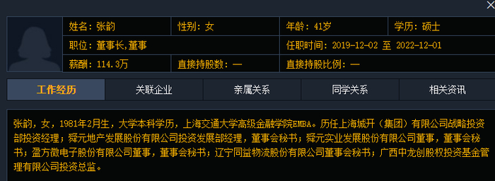 张韵,女,41岁。从简历上看,张韵有舜元方面工作的背景,除了担任过盈方微董事、董秘,其他工作经历和投资相关。