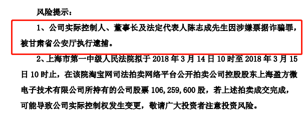 2018年2月14日,盈方微公告,公司实际控制人、董事长及法定代表人陈志成因涉嫌票据诈骗罪,被甘肃省公安厅执行逮捕。