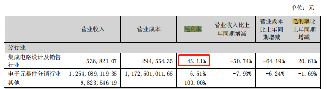 半年报显示,*ST盈方集成电路设计及销售业务的毛利率是45.13%,电子元器件分销仅有6.51%。*ST盈方主要收入还是电子元器件分销,毛利率较高的集成电路设计及销售业务占比还是太小了。