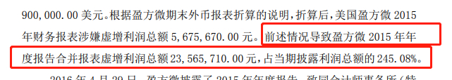 2015年年度,盈方微报告合并报表虚增利润总额2356.57万元,占当期披露利润总额的245.08%。