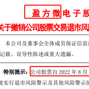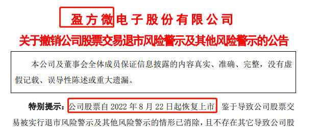 8月14日晚间,*ST盈方公告称,公司收到深交所《关于同意盈方微电子股份有限公司股票恢复上市的决定》,根据审议意见,公司股票于8月22日恢复上市。