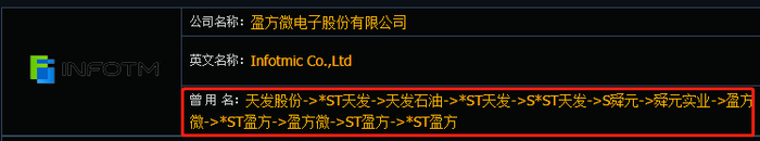 *ST盈方,全称是盈方微电子股份有限公司。曾用名天发股份→*ST天发→天发石油→*ST天发→S*ST天发→S舜元→舜元实业→盈方微→*ST盈方→盈方微→ST盈方。