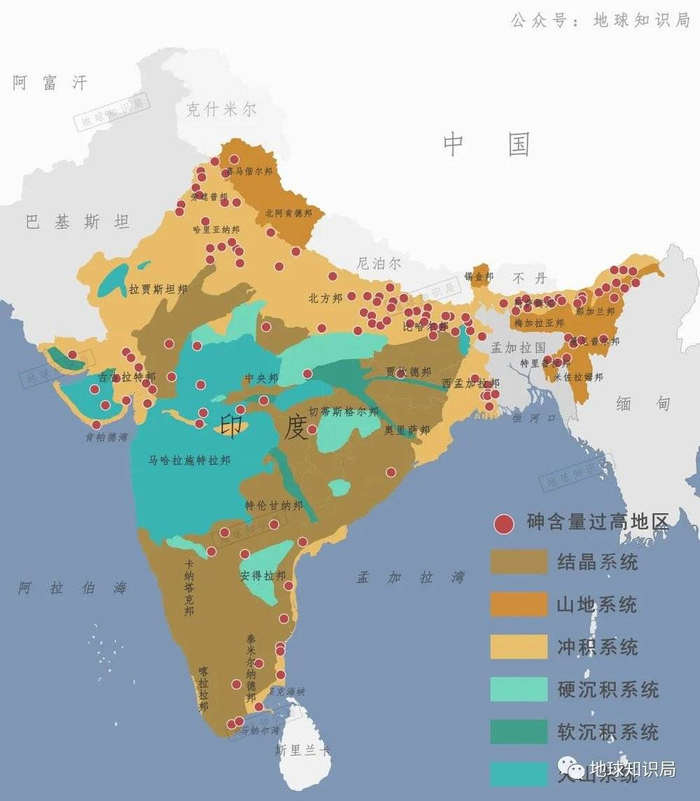 冲积含水层是印度砷的主要来源(90%),硬岩含水层仅占 10%(砷污染与含水层类型的关系 参考:CGWB)▼