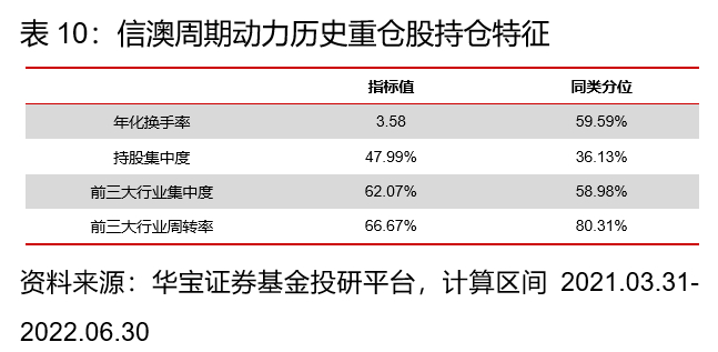 我们认为基金经理的持股特征可能导致组合呈现高频交易特征,根据信澳周期动力各期公开报告,整体权益持仓特征上,分析区间年化换手率3.58倍,位于同类样本的59.59%分位,换手率适中;