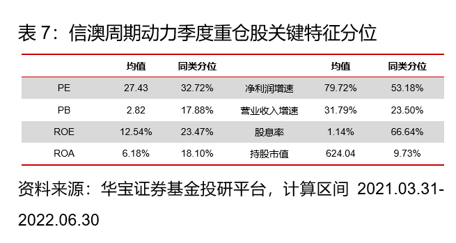 我们认为基金经理有以下几点特征:(1)投资范围更多偏上游周期和中游制造,重仓行业为化工、机械、国防军工;(2)基金经理基于信达澳亚QGV投资框架选股,对成长和估值更加看重;(3)实际操作主要基于估值的景气轮动,自下而上地对行业景气度和公司估值进行判断,力求平衡组合波动;(4)在自下而上选股的基础上,自上而下调整持仓结构以控制组合风险。
