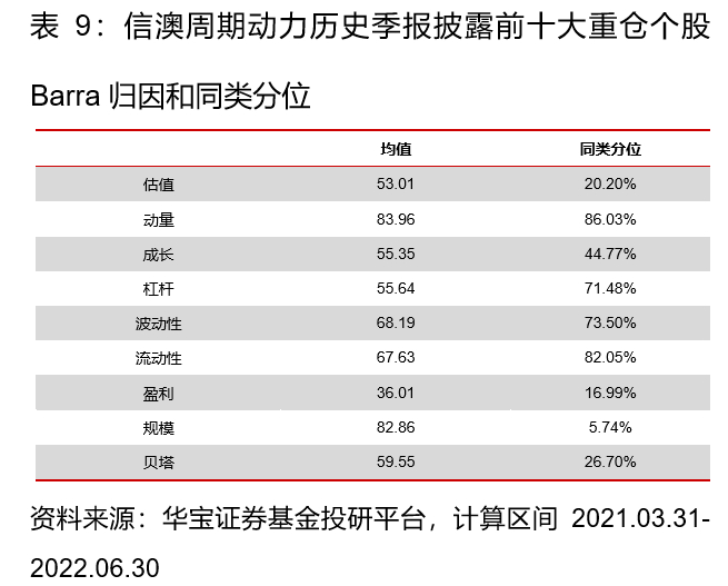 使用PB衡量持仓股的估值,信澳周期动力的各期重仓股的平均PB为2.82,处于同类17.88%分位;使用全部持仓进行Barra归因,在估值因子上,基金经理对估值的容忍度较低:暴露度得分稳定在53左右,同类分位20%。