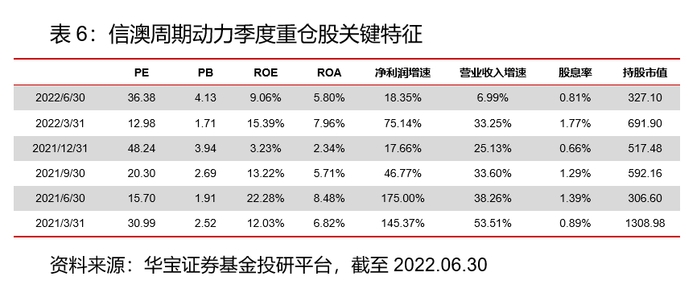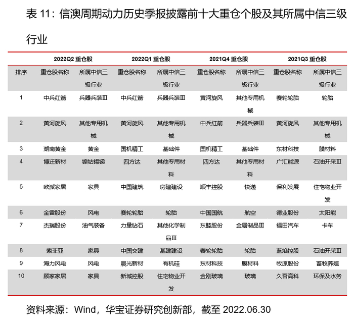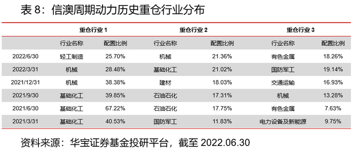 根据各期重仓行业分布,基础化工、机械、国防军工配置比例均值较高,分别为30.51%、16.92%和10.12%,最新一期的重仓持股中,轻工制造、机械、有色金属的配置比例较高。