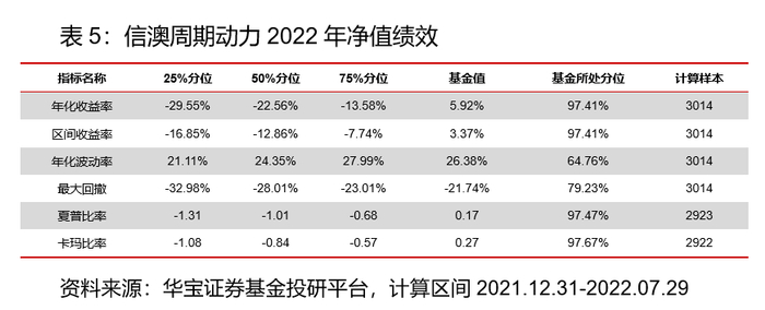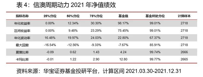 自任职以来,信澳周期动力年化收益率、夏普比率、卡玛比率在同类产品中排名居前,波动处于同类中等偏高水平,最大回撤处于行业后80%分位,整体风险收益特征出色。