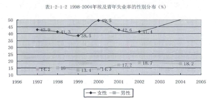 在1998~2004年见,埃及的青年人失业率一直居高不下,而且根本没有好转的迹象。