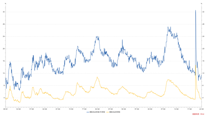 而青年的失业率,往往和整体的失业率同步变化,有些时候会稍稍领先1个月,但整体的变化幅度更大,另外,青年失业率的绝对水平也更高。