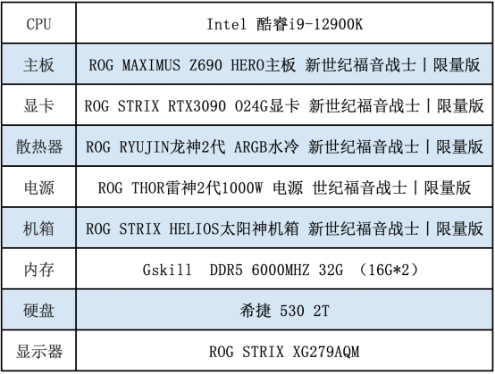 童锦程的另一套主机选择了ROG与EVA联名的限量版全家桶,处理器同样是性能强劲的Intel酷睿i9-12900K,其强力的性能可以轻松满足各项需求。而显卡则选择了ROG STRIX RTX3090 O24G新世纪福音战士丨限量版。作为与EVA联动的限量主板,经典的紫绿配色必不可少,其中交织着代表使徒的红色核心纹路,可谓是诚意满满。性能方面更不用多说,核心频率最高可达1725MHz,搭配10496个CUDA核心以及24GB GDDR6X高速显存,其实力不可小觑。