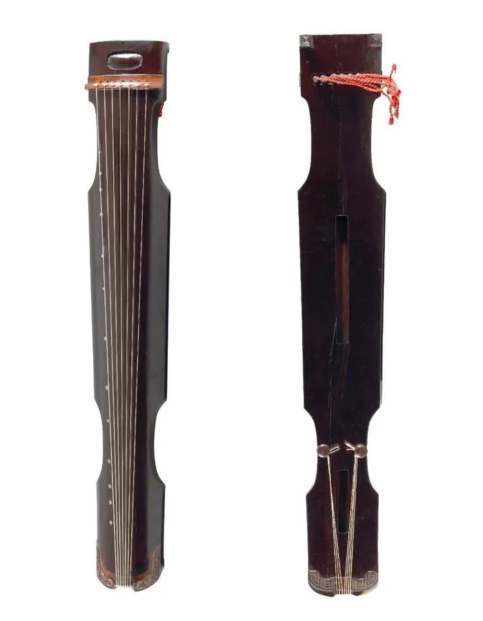 长沙马王堆一号汉墓中出土的二十五弦瑟原裹有瑟衣,部件齐全,柱位清楚。二十五根丝弦系于木枘(ruì),每根弦下有可移动的调音柱,底部两端有共鸣窗。瑟有两种弹奏方法,一是横瑟于膝前,双手并弹;二是将瑟一端置于膝上,另一端斜置于地,右手弹膝上一端的弦,左手按瑟面中部的弦。瑟的声音富有感染力,能够表达丰富的思想感情。故有舜帝南巡不返,帝妃湘灵垂泪鼓瑟的故事。上图中的西汉二十五弦瑟为我国现存最完整的古瑟,为研究古代音乐史及汉代乐器的演奏方法提供了非常可贵的实物资料,大大丰富了我们对于汉代音乐文化发展水平的了解。