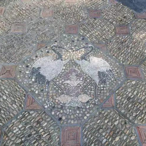 冰裂纹是指自然界中的冰块炸裂所产生的纹样,使用冰裂纹作为铺地,不但美丽,还能向人们传递出一种“自然”的讯息,使人产生如身在大自然中的愉悦感受。它常与六角雪花结合,组成冰雪图案,一般采用鹅卵石与瓦片铺成,意在以冰雪的洁白纯净示意园主人高洁的品格。