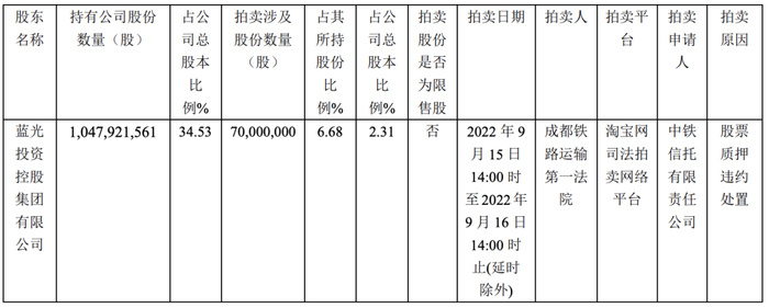 截至8月15日,蓝光集团持有蓝光发展股份1047921561股,占公司总股本的34.53%。本次被司法拍卖的股份为蓝光集团持有的公司股票7000万股,占公司总股本的2.31%。
