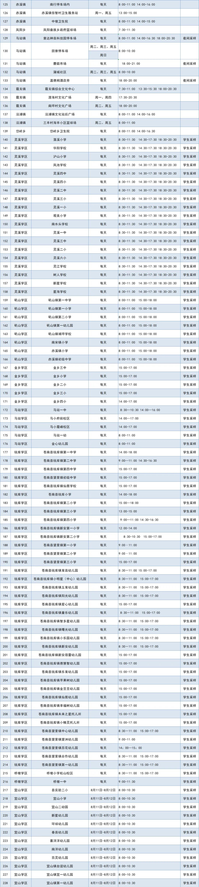 灵溪镇、炎亭镇、桥墩镇、莒溪镇、矾山镇、马站镇、霞关镇等7个乡镇所有居民(包括本地常住人口、外来人员等),在8月17日-18日连续2天开展两轮全员核酸检测工作,其他乡镇要按照3天一轮全覆盖的要求开展常态化核酸检测。