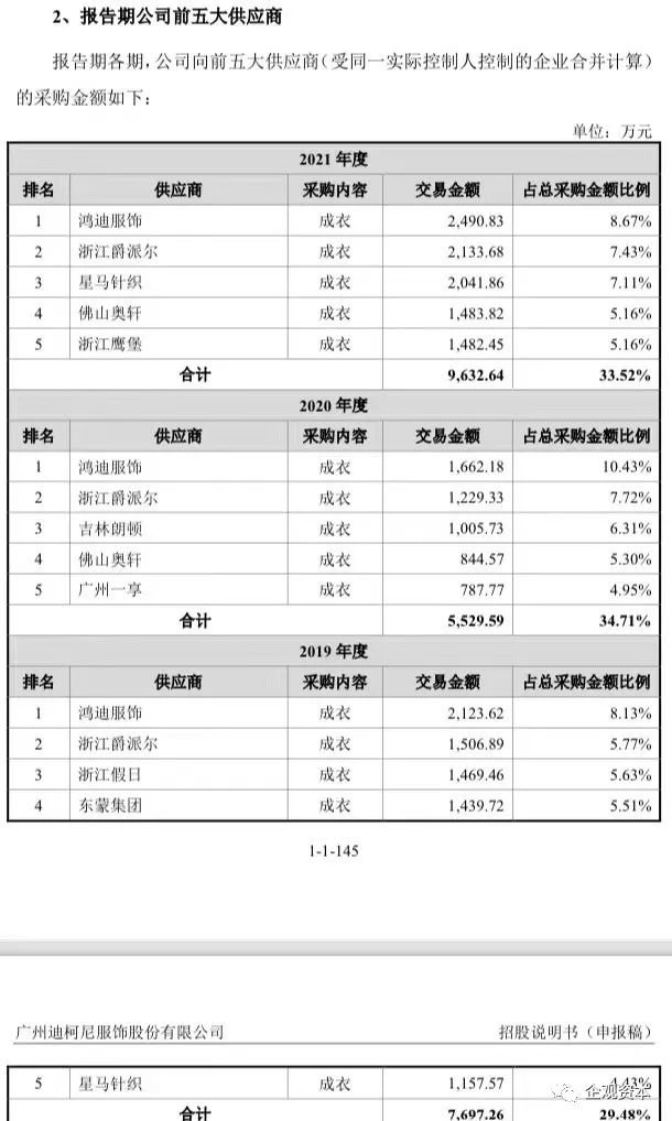 观察迪柯尼的供应商,其前五大供应商鸿迪服饰、浙江爵派尔、星马针织、东蒙集团等,均是位于浙江温州或浙江嘉兴、股东及高管仅有两人的小微企业,如浙江爵派尔的主要股东及高管仅为贾伟平和贾润,星马针织的股东仅为魏建华和张晓锋。