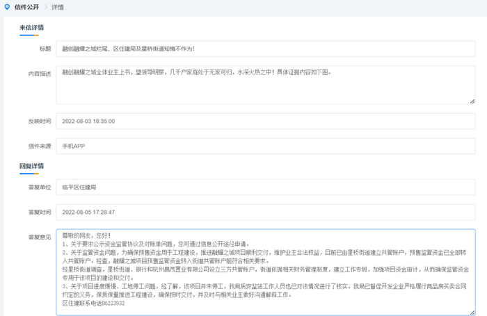 2022年8月7日,临平区住建局针对融创融望之城业主投诉回复表示,关于要求公示资金监管协议及对账单问题,业主可通过信息公开途径申请。