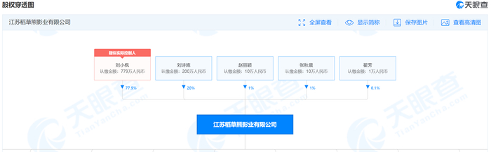 江苏稻草熊影业有限公司是稻草熊娱乐在内地的运营公司,前者2014年由刘小枫成立于江苏南京,2015年,其发行首部电视剧《蜀山战纪之剑侠传奇》,吴奇隆、赵丽颖为主演。目前稻草熊影业前三大股东为刘小枫、刘诗施(刘诗诗)、赵丽颖,持股比例分别为77.9%、20%和1%。