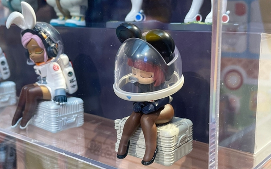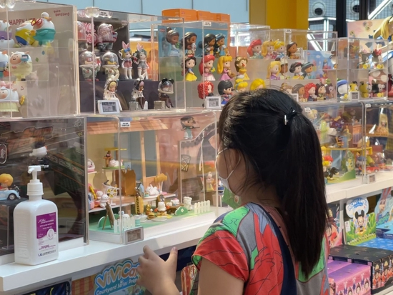 一名梳着马尾辫的小女孩正在注视着COOLABO宇宙朋友系列玩偶。 图/新京报贝壳财经记者于梦儿摄