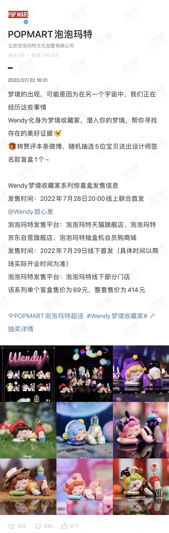 泡泡玛特该系列盲盒宣传语为“梦境的出现,可能是因为在另一个宇宙中,我们正在经历这些事情。”图/POPMART泡泡玛特微博截图