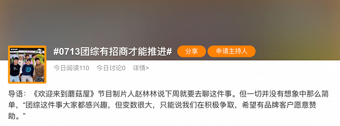 4月,#0713团综有招商才能推进#登上微博热搜,六位艺人与导演团队在线招商,甚至引来一众网友为节目组@各大品牌商,在微博上上演了一场大型直播招商的戏码,成功捞得金主五谷道场。