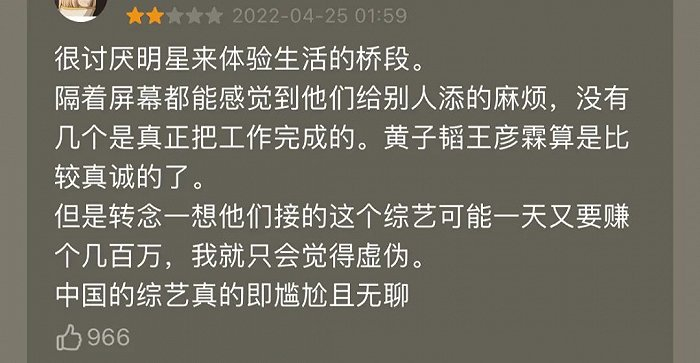 从第四期就超过13亿次的播放量来看,《新游记》无疑是成功的。但口碑上,却是令人失望的。“明星嘉宾体验普通人的平凡生活”的节目设定,在明星日薪208万的社会语境下,显得十分苍白。观众不仅觉得很难代入,甚至有一种被居高临下微服私访的不适感。已经身处人间的观众们,真的有必要再去看明星“下凡”体验人间疾苦吗?