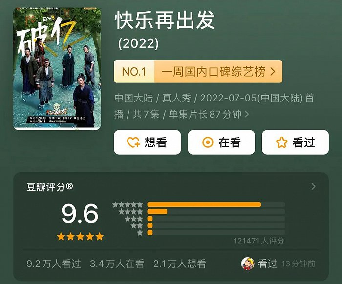 从播放热度看,《快乐再出发》与同期“热综”当然存在一定距离。但在当下爆款稀缺、进入冷静期的市场环境中,一档轻体量“穷综”能以9.6分的豆瓣评分突出重围、成为本季综艺黑马,仍具备一定的样本意义。