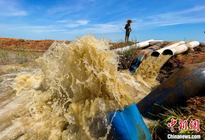 江西省九江市都昌县周溪镇枭阳10号附坝,抽水泵在鄱阳湖取水,经过三级提灌,为坝内五千亩稻田灌溉保苗。 傅建斌 摄