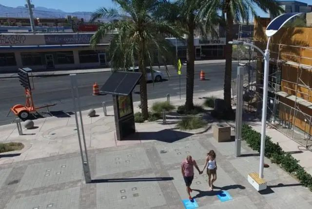 而在拉斯维加斯的boulder广场,一家名叫engoplanet的公司为其研发了一款清洁能源的路灯,其连接着装有三个迷你发电器的的踏板。每次有人走上这个踏板的时候,就会产生5瓦左右的电量,然后就被输送到了电池中去。