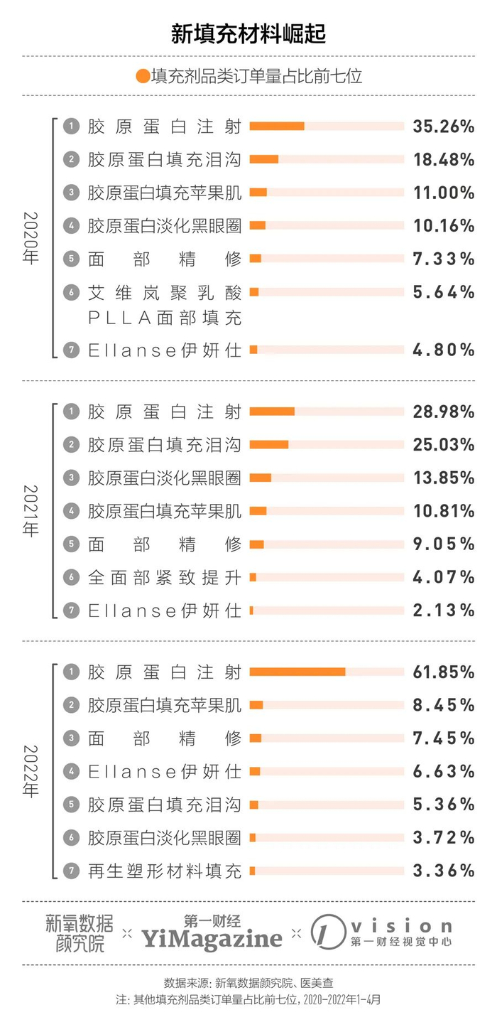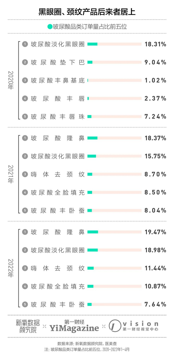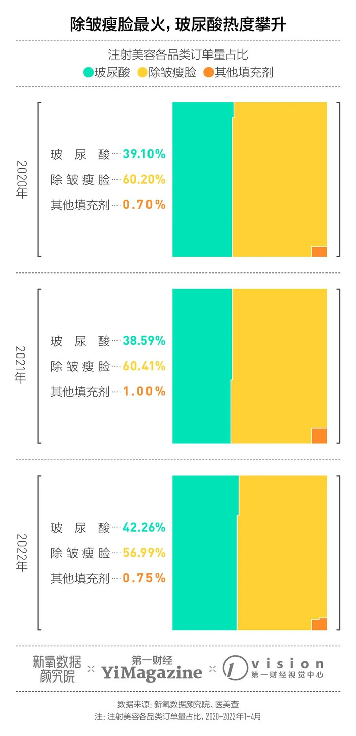 注射美容下的细分赛道一时间成为热门项目,并强势占据轻医美消费领域的重要市场份额,而这也正加速医美消费的大众化趋势。