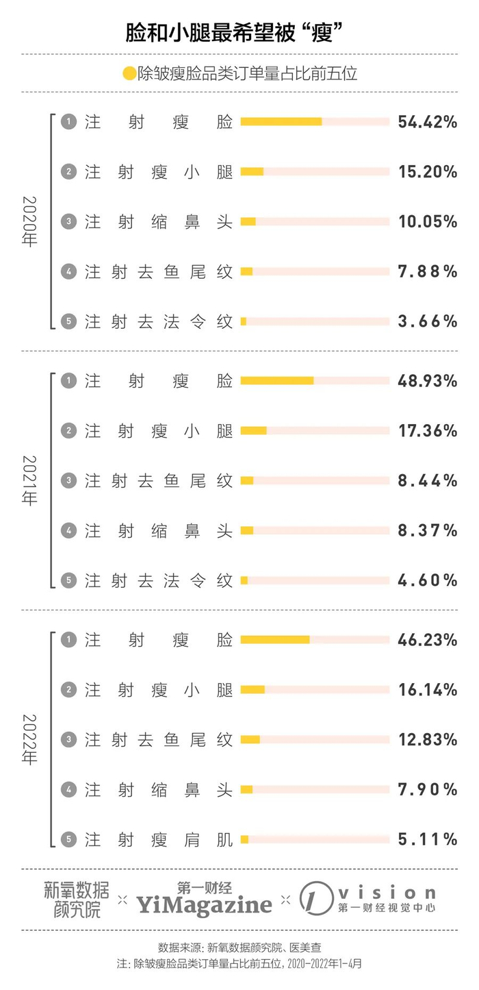 而以肉毒素注射为主的除皱瘦脸消费,则是该年下单人数最多的项目,根据新氧数据颜究院近三年同期数据对比(2020年1~4月、2021年1~4月、2022年1~4月),在所有注射类项目中,除皱瘦脸项目始终处于消费的“C位”,以玻尿酸和肉毒素为代表的注射类医美项目因其便捷、高效、客单价低、恢复期短的特性“破圈”,在所有消费项目中表现突出。