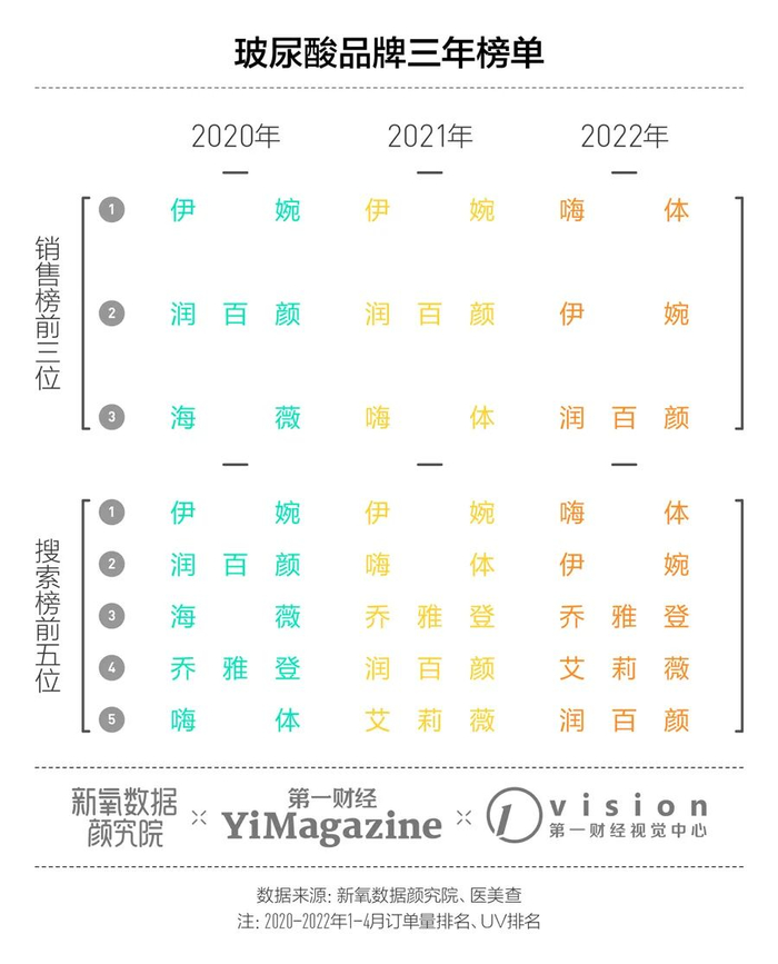 从新氧平台的玻尿酸产品三年榜单来看,无论是销售榜还是搜索榜,得益于产品的精细定位,嗨体熊猫和嗨体去颈纹一跃成为2022年玻尿酸产品中的“黑马”,压过传统进口产品。而传统产品也在激烈的市场竞争中浮浮沉沉。