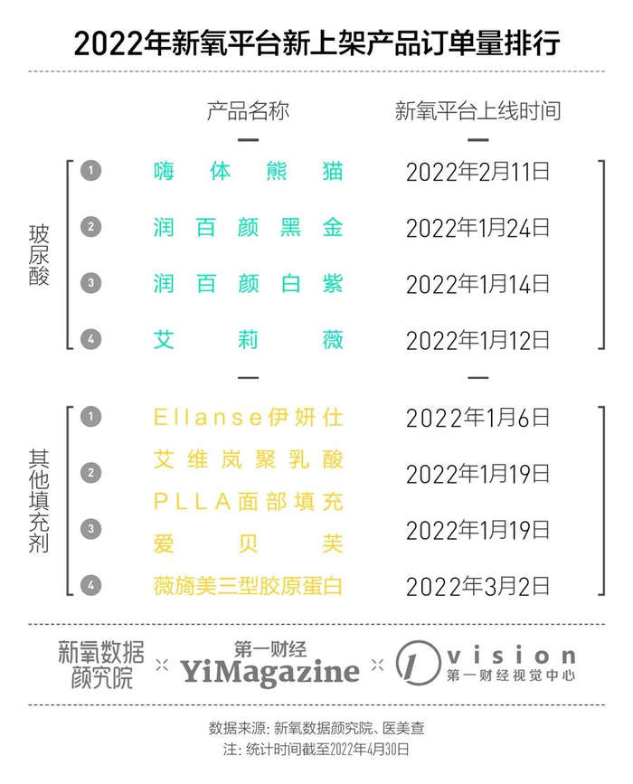 从新氧在2022年新上架的产品订单量来看,嗨体熊猫、润百颜黑金和白紫占据玻尿酸产品订单量排行的前三位,在其他填充剂的类目中,Ellanse伊妍仕、艾维岚聚乳酸PLLA面部填充、爱贝芙则占据榜内的前三位。