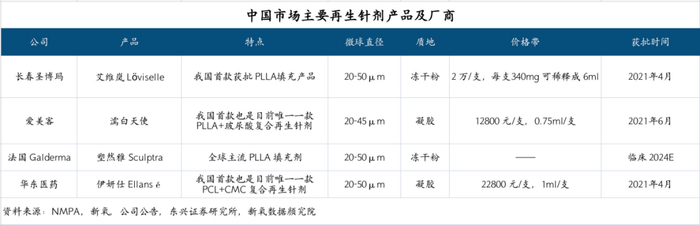 我国目前已获批和在研再生针剂中,仅爱美客濡白天使和华东医药伊妍仕为复合配方、溶液质地,产品兼具即刻填充+长期再生效果,具有更强的产品力优势。