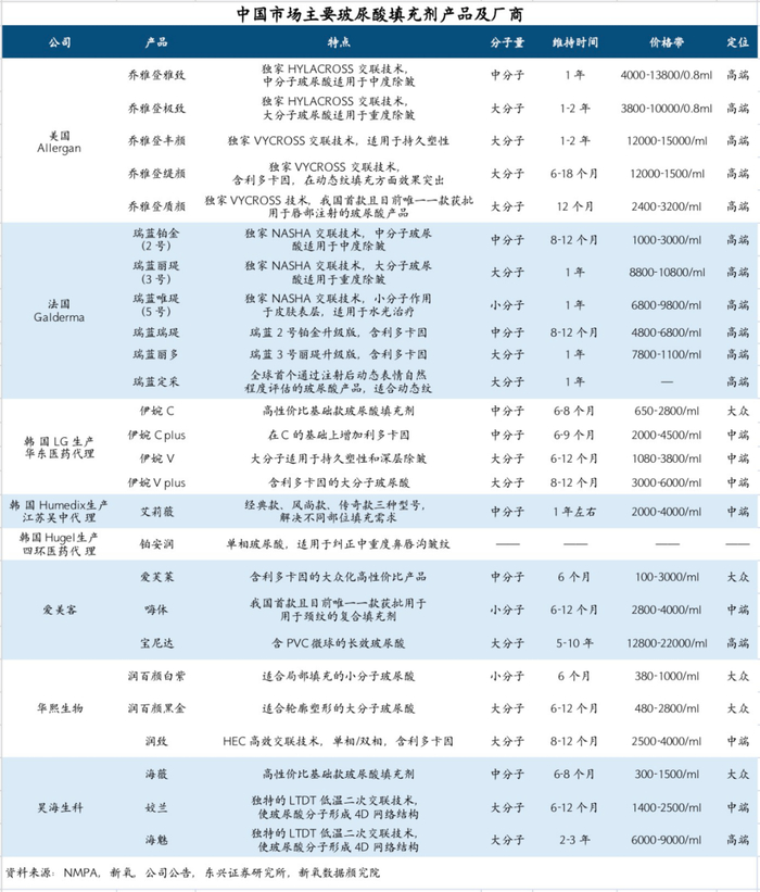水光针虽然成为国内求美者入门级的医美产品,但目前中国水光针市场合规产品数量较少,目前仅包括华熙生物的熨纹针、娃娃针,爱美客的嗨体 2.5ml、冭活泡泡针,Q-Med AB 的瑞蓝·唯缇 TM,双美的肤柔美。