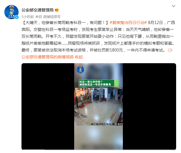 8月12日,广西宾阳。交警在科目一考场监考时,发现考生廖某举止异常:当天天气晴朗,他却穿着一双长筒雨靴。开考不久,民警发现廖某开始耍小动作:只见他弯下腰,从雨靴里掏出一踏纸片偷偷地翻看起来……民警现场将其抓获,发现纸片上都是手抄的模拟考题和答案。最终,廖某被依法取消本场考试资格,并被处罚款1800元,一年内不得申请考试。
