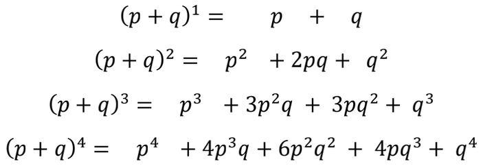 本文关注概率问题,概率不能简单相加!一般教科书里处理的简单概率问题,会用到与二项式展开 (p+q)n 相关的杨辉三角 (Pascal triangle) 方面的知识。让我们一起回顾一下。二项式展开 (p+q)n 的前几项如下: