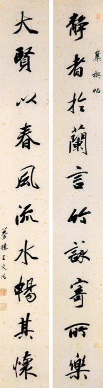集《兰亭序》十言联纵219.5厘米,横29.7厘米,现藏上海博物馆。释文:静者于兰言竹咏寄所乐;大贤以春风流水畅其怀。集禊帖,梦楼王文治。