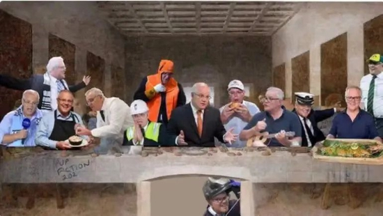 梗图改自《最后的晚餐》,图中的莫里森既是总理,又是主持人、乐手、大厨等。