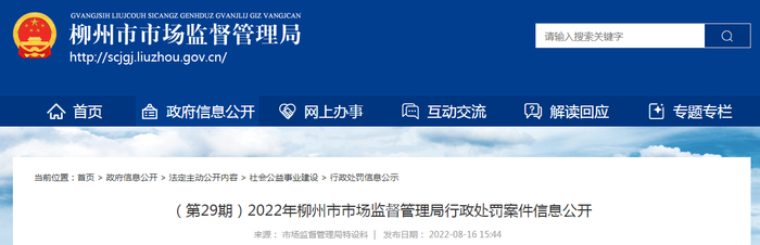 广西柳州市市场监督管理局公开2022年第29期行政处罚案件信息