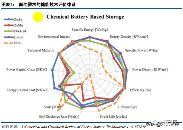 储能技术归根到底是面向需求的技术,其评价指标体系涵盖能量指标、功率指标、规模指标、寿命指标、 效率指标、自放率指标、成本指标、环境影响指标等等。随应用场景不同,储能技术对指标的需求类型与权重 也有所不同。以消费电池、动力电池、储能电池为例,消费电池倾向于较高的体积、质量能量密度,以及较高的充电倍 率;动力电池要求均衡,成本权重高;储能电池的能量、功率相关指标可适当放宽,而对寿命、成本相关指标 要求很高。