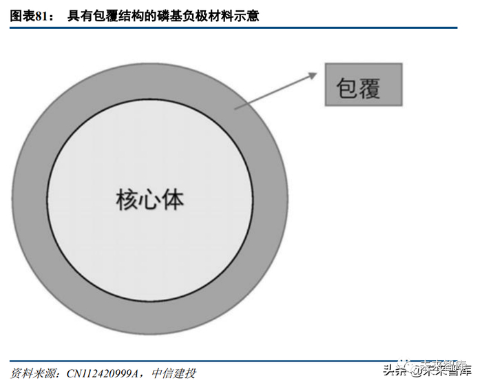 振华新材公布于 2021 年的专利 CN112420999A 描述了一种用于锂/钠/钾离子电池的具有包覆结构的磷基负 极材料。所述核心体由磷基材料组成,包覆层材料为 MaXb 或碳基材料。研究者认为,这种磷基负极材料不仅 可以抑制循环过程产物磷化锂的溶出,并且可以抑制电极界面与电解液之间的副反应,从而改善电池的循环寿 命。从实施例看,以氮化钛包覆磷化钠得到的磷基负极具备接近 1000mAh/g 的放电比容量,在循环 200 圈后容 量保持率接近 60%。(报告来源:未来智库)