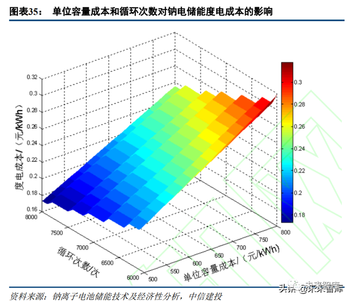 当前钠离子电池技术尚不成熟,度电总成本处在约 0.8-1 元/Wh 区间。未来,随技术进步与成熟化,规模效 应体现等原因,钠电的成本有一半甚至更多的下降空间。相比于锂离子电池,约 0.1 元/Wh 甚至更大的成本优 势可以期待。也有研究者归纳,对于钠离子电池储能电站,当初始容量投资在 500~700 元/kWh,循环次数在 6000 周时, 钠离子电池储能系统度电成本可实现 0.217~0.285 元/kWh;当循环次数在 8000 周时,钠离子电池储能系统度 电成本可下探至 0.2 元/kWh 以内。此时,钠离子电池在放电深度、温度适应性等方面的优势也有所体现。